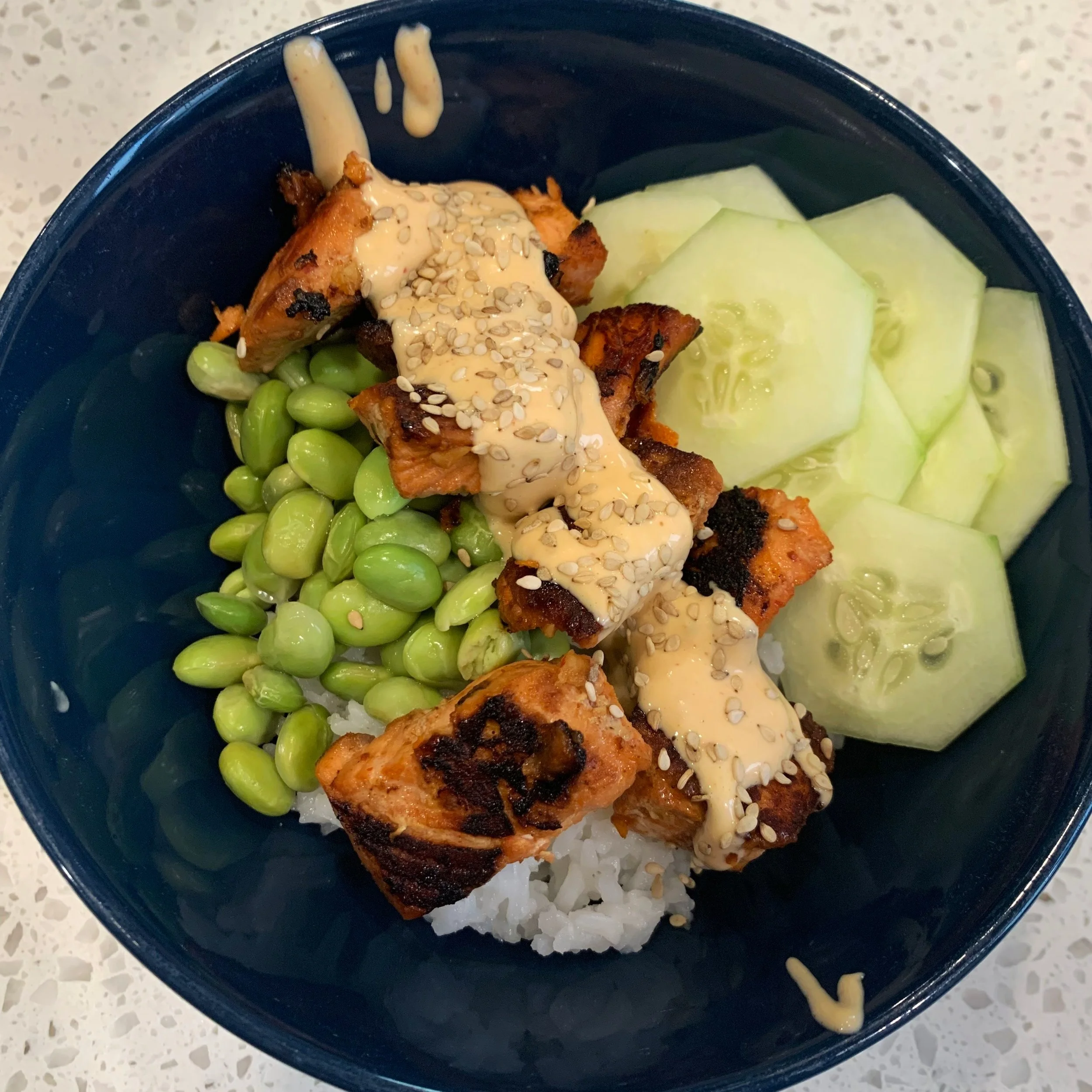 Photo of the Hot Honey Salmon Bowls we had this week - my favorite way to eat salmon!! This is one of the recipes included in my Simple & Nourishing 4 Week Meal Plan. Click here to check it out!